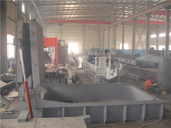 滚动式液压操纵舱盖可分为滚翻式、滚卷式和滚移式三种形式。船上通常采用的是滚翻式液压操纵舱盖。滚翻式液压操纵舱盖由盖板、水密装置、滚轮装置、导向曳行装置和压紧装置5部分组成。各盖板之间有链条连接,每块盖板均设有一对偏心轮,可沿舱口围板两边的面板行走,还有一个平衡轮,它不设在盖板宽的中点处。当盖板进入舱口端的收藏坡道时,在重力作用下盖板便翻转成直立状态而存放。舱口较长的将全部盖板分成两半,开启后分别存放在舱口的两端。